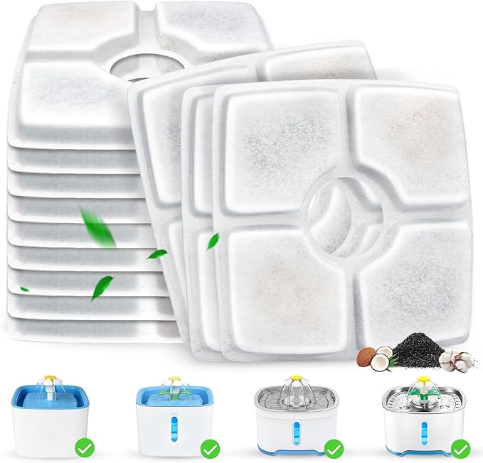 - 【12 Pack Filters Set】Beyolike premium cat fountain filters set includes 12 pcs replacement filters, triple filtration system square carbon filters for cat water fountain can effectively filters out food debris and pet hair, ensures fresh and clean drinking water for cat dog, keep your pet healthy.