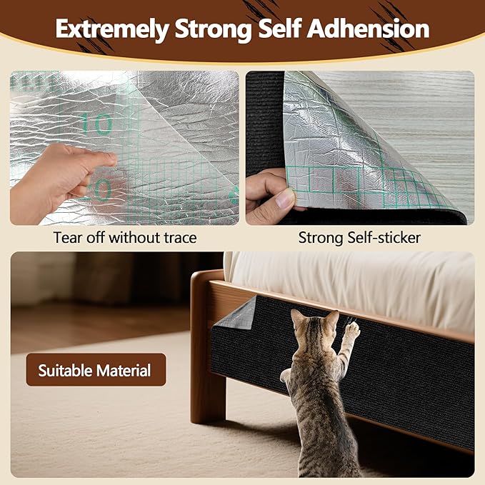 - Effortless Self-Adhesive Installation-Peel-and-stick design requires no tools or extra adhesives. Simply clean the surface, apply the mat, and press firmly. Includes spare adhesive strips and screws for versatile installation on walls, cat trees, or irregular surfaces. Removes cleanly, preserving furniture aesthetics.