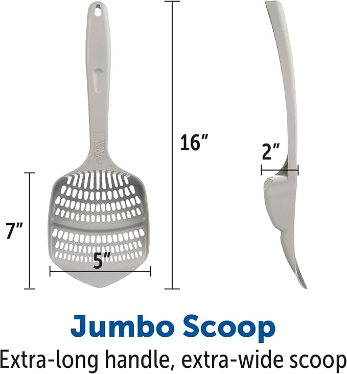 - JUMBO SCOOP features a 9-inch handle and a 5-inch scoop and works with all types of litter, making litter box cleaning easier and more convenient.