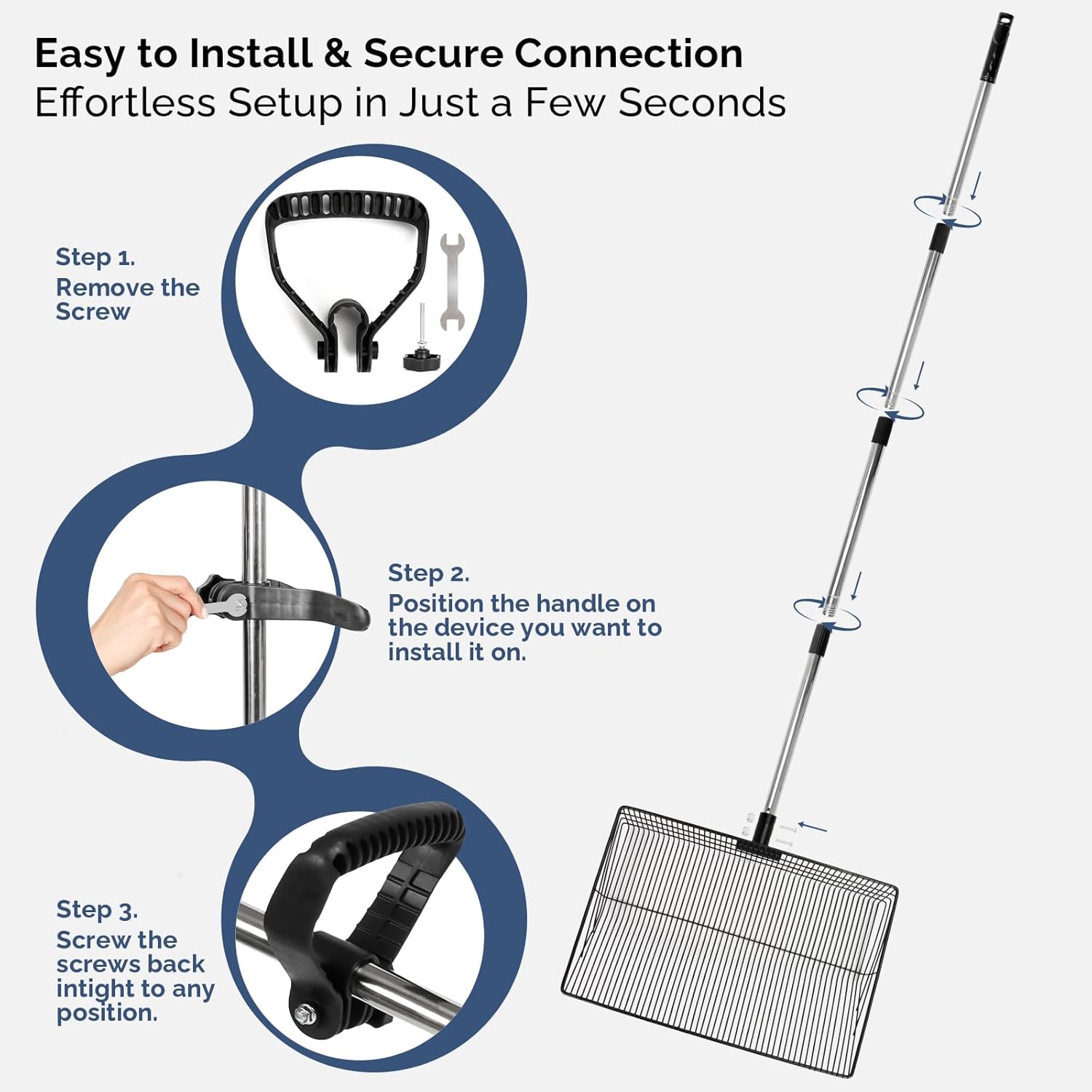 - 𝐒𝐭𝐮𝐫𝐝𝐲 𝐒𝐭𝐚𝐢𝐧𝐥𝐞𝐬𝐬 𝐒𝐭𝐞𝐞𝐥 𝐂𝐨𝐧𝐬𝐭𝐫𝐮𝐜𝐭𝐢𝐨𝐧 – 𝐁𝐮𝐢𝐥𝐭 𝐭𝐨 𝐋𝐚𝐬𝐭: Heavy-duty, rust-resistant stainless steel head and handle stand up to daily use and harsh outdoor conditions. The non-stick finish prevents bedding and waste from sticking, making cleanup quick and effortless with a simple rinse.