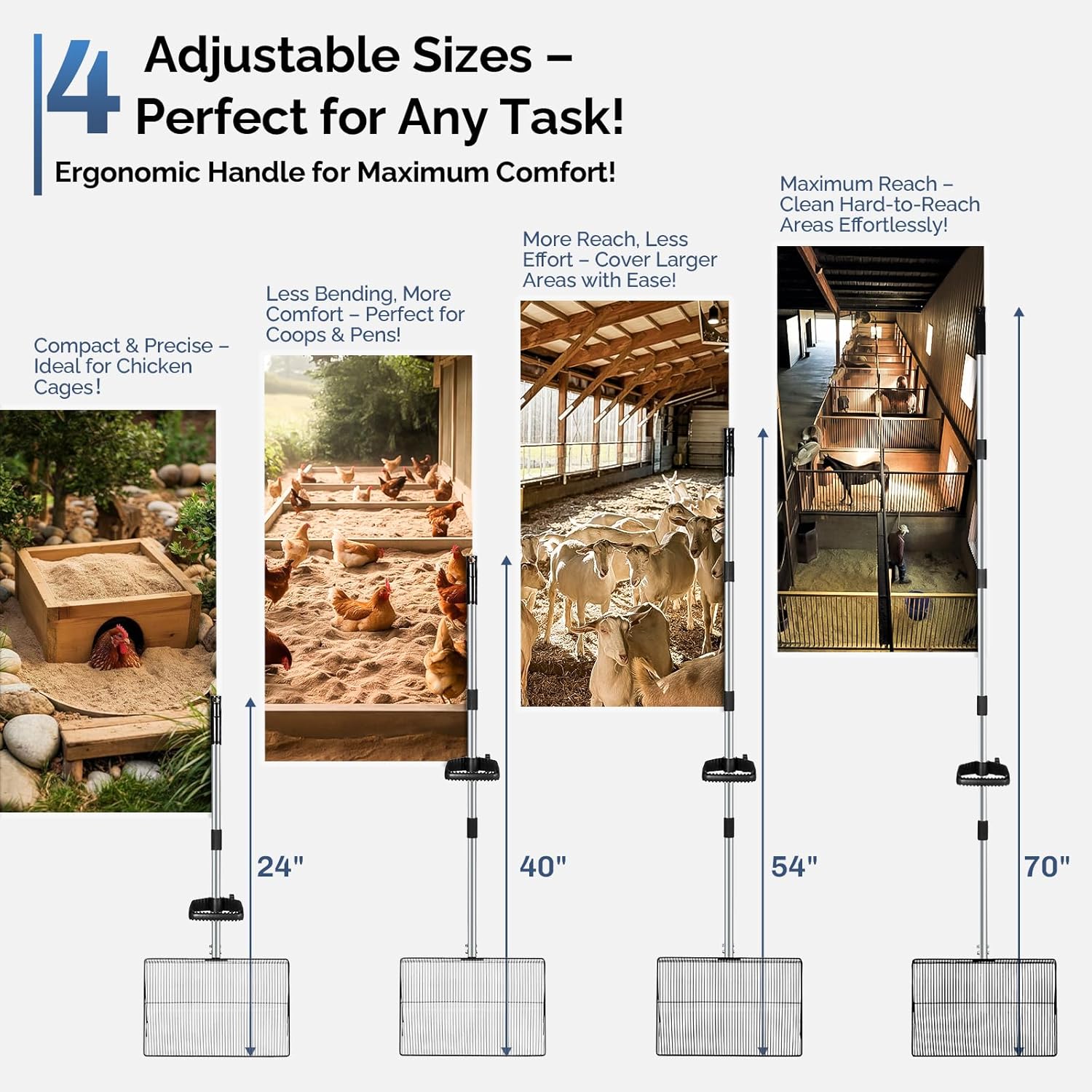 - 𝐄𝐫𝐠𝐨𝐧𝐨𝐦𝐢𝐜 & 𝐀𝐝𝐣𝐮𝐬𝐭𝐚𝐛𝐥𝐞 𝐋𝐨𝐧𝐠 𝐇𝐚𝐧𝐝𝐥𝐞 – 𝐒𝐚𝐯𝐞 𝐘𝐨𝐮𝐫 𝐁𝐚𝐜𝐤: The handle extends from 24 to 70 inches, allowing for adjustable length based on your height. Our Hdnbsp chicken coop cleaning tools can be adjusted to four different specification sizes: 24 inches, 40 inches, 54 inches, and 70 inches. Say goodbye to bending over and back pain while cleaning your chicken coop, goat stalls, or horse barns. Clean standing up with ease!