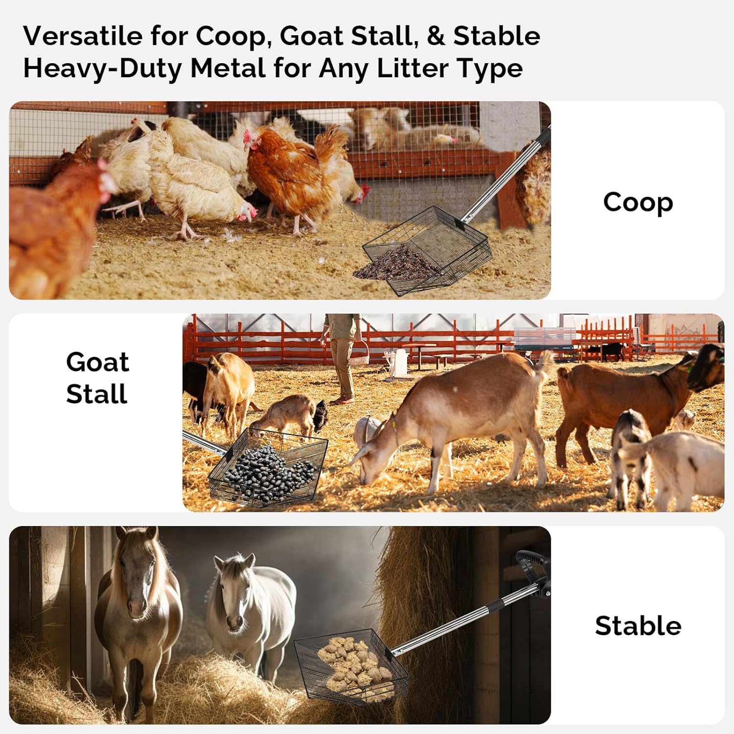 - 𝐌𝐨𝐫𝐞 𝐭𝐡𝐚𝐧 𝐣𝐮𝐬𝐭 𝐚 𝐜𝐡𝐢𝐜𝐤𝐞𝐧 𝐬𝐜𝐨𝐨𝐩𝐞𝐫: This multifunctional chicken pooper scooper works in chicken coops, goat stalls, horse stables, and more. The sturdy stainless steel construction handles all types of litter and waste. Perfect for cleaning sand, hay, or bedding, and also great for sifting cat litter, raking pine shavings in rabbit hutches, or cleaning dog kennels. The angled edges glide easily through packed bedding, grass, and gravel.