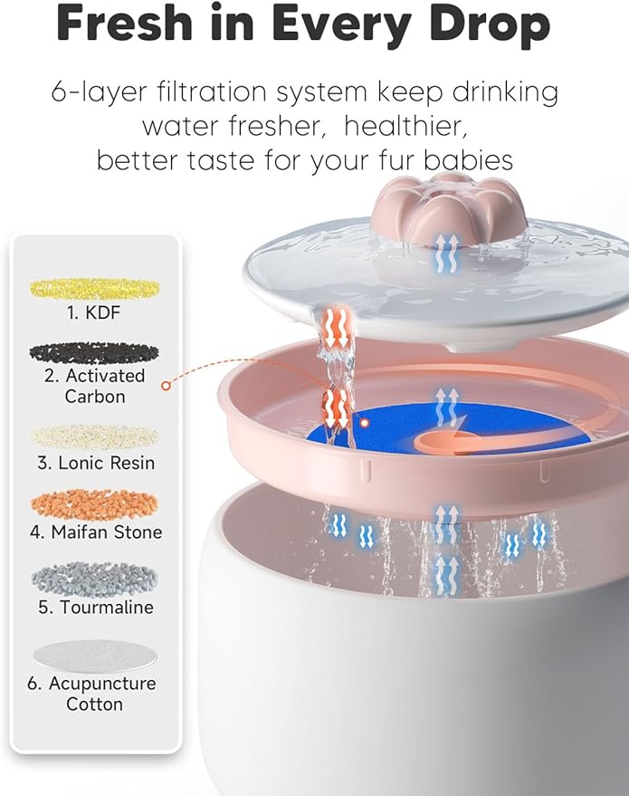 - Multiple Filtering System: our cat water fountain uses upgraded wopet filter, which increases the use of filtration materials to provide excellent water purification.the sponge can filter impurities, and the carbon filter can soften water quality, improve taste, provide purer water for your lovely pets.