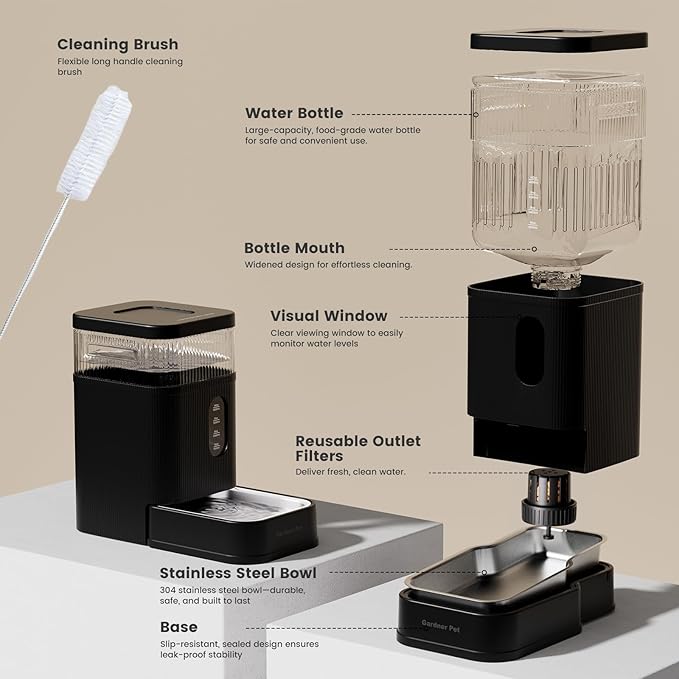 - Premium Pet-Safe Materials - Gardner Pert dog water bowl dispenser comes with 304 stainless steel bowl + cleaning brush guarantees a safe, easy-to-clean water supply for pets.