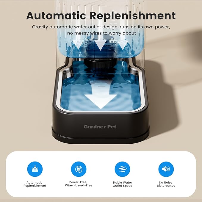 Gardner Pet Automatic Dog Water Dispenser Gravity Waterer with Stainless Steel Bowl Water Dispenser 6.5L Large Capacity Water Feeder for Dogs Cats Pets, BPA-Free Noise-Free (Black, 6.5L)
