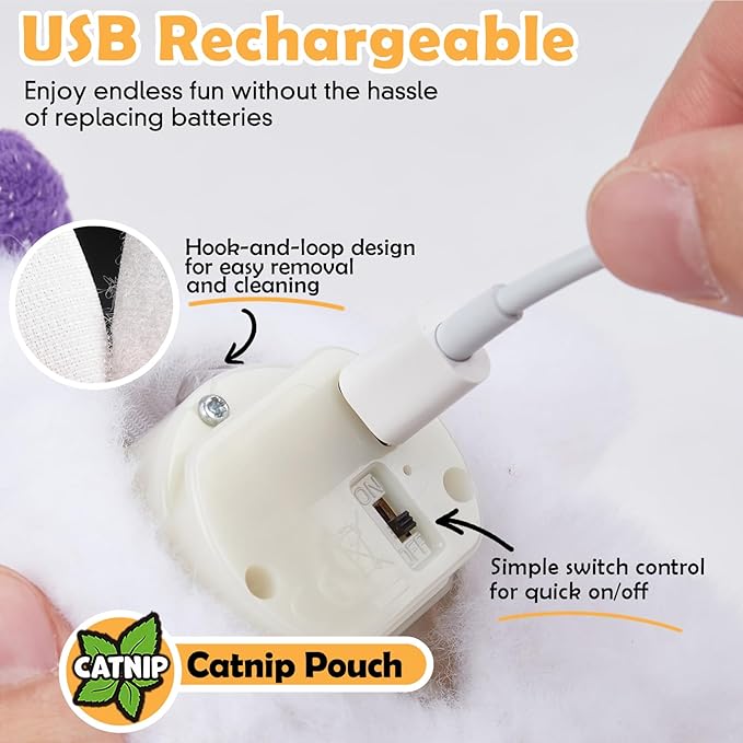 - 【USB Rechargeable & Intelligent】Our halloween cat toy is USB rechargeable with a long battery life. It's intelligently designed to pause every 15 seconds of inactivity, conserving energy. But don't worry, it springs back to life as soon as your cat interacts with it