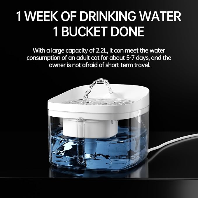 - 【2.2L large capacity】Never worry about constantly refilling the water bowl. With its generous 2.2-liter capacity, this pet water fountain provides an ample amount of water for dogs, cats, and birds. Spend less time on maintenance and more quality time with your beloved pets.