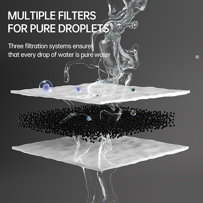 - 【Activated Carbon Filter】Equipped with an activated carbon filter, this pet water fountain effectively removes impurities, odors, and chlorine from the water, providing your pets with clean and fresh water every time they take a sip. We recommend replacing the fountain filter every month and cleaning the pump's filter regularly.