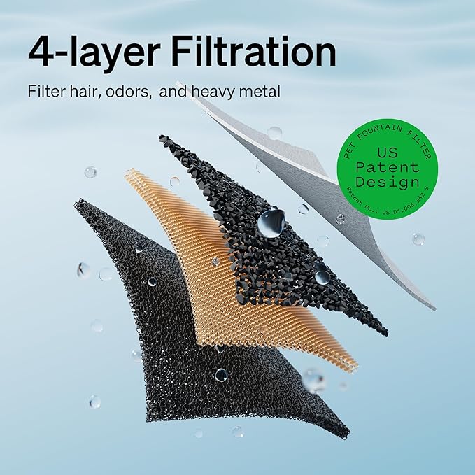 - Vertical Filtration System – The pet water fountains for cats indoor use a multi-layer filtration system to provide your cat with clean, fresh, and oxygen-enriched water. The activated carbon eliminates foul odors, ion exchange resin softens the water and removes heavy metals, the non-woven fabric captures cat hair and impurities, and the built-in pump sponge filters debris to prevent blockages and damage.