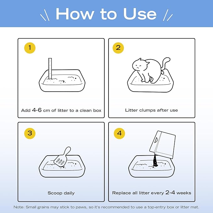 - Note: Due to the fine texture of this kitty litter, some tracking may occur. We recommend using a top-entry litter box or a litter mat to help reduce scatter. Do NOT flush.