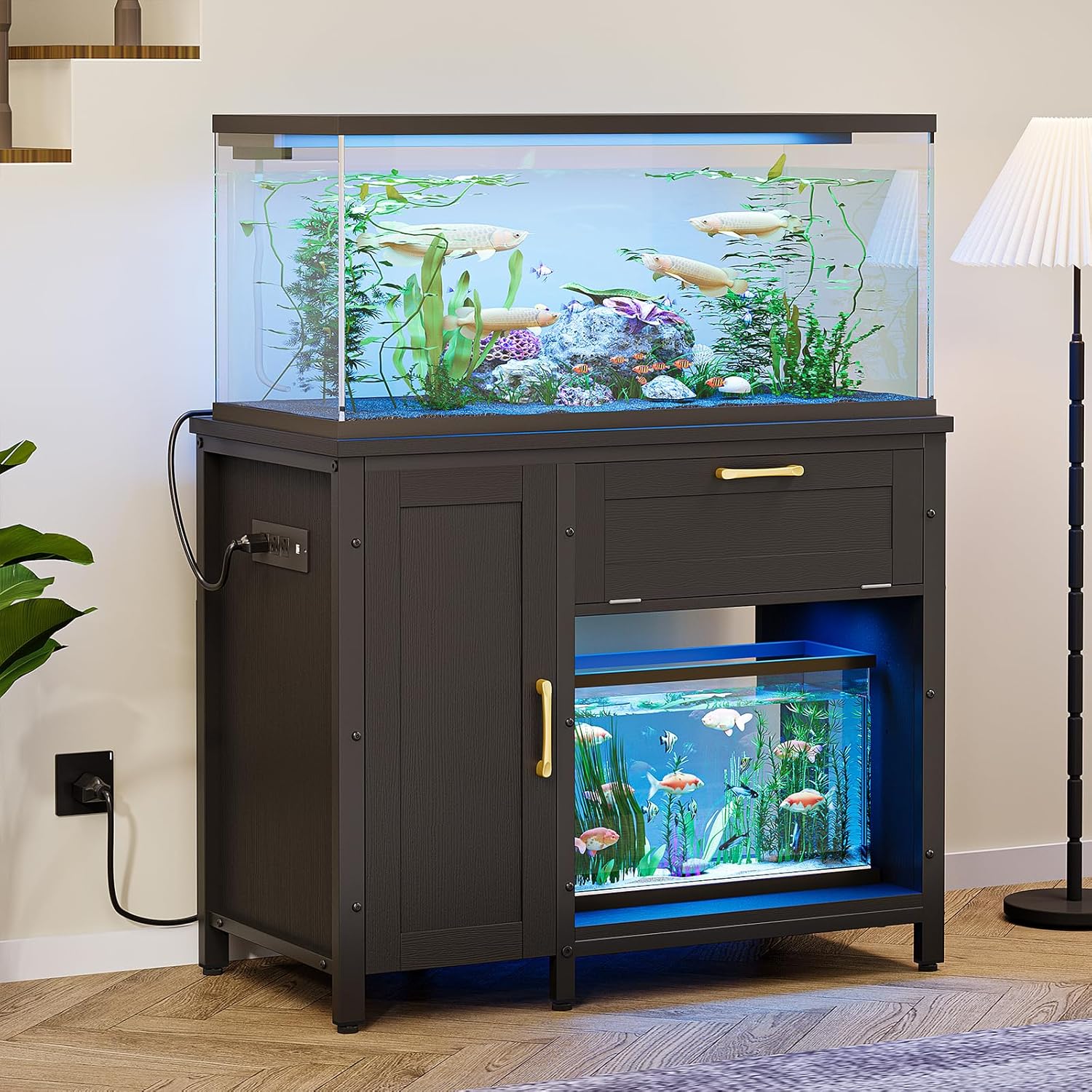 - Sturdy and Stable: The 50 gallon fish tank stand with charging station crafted from P2-grade particle board and reinforced with thick metal legs, supports up to 746 lbs. The additional small tank space can accommodate up to 150 lbs, ensuring reliable stability for your aquarium setup