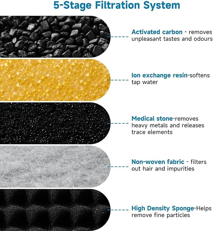 - 【High-Quality Filtration System】The 5-stage filtration system continuously provides your pet with fresh and healthy water. Activated carbon removes unpleasant odors and tastes. Ion exchange resin softens tap water. Medical-grade stone removes heavy metals and releases trace elements. Non-woven fabric filters out hair and impurities. The pump's high-density sponge helps remove fine particles.