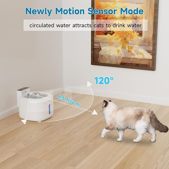- 【Dual Water Mode】The pet water fountain offers two modes: continuous and motion-sensing, allowing you to switch between them as needed. In motion-activated mode, water flows when the cat approaches (within 6.5 feet/2 meters and 120º), perfectly mimicking a cat turning on a faucet, greatly stimulating their interest in drinking. Alternatively, you can switch to continuous mode.The water streaming down the fountain will draw your pets attention and encourage animals to drink more often.
