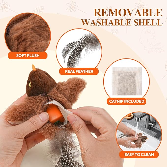 - 【Safe Material & Easy to Clean】: Made from durable yet soft plush with realistic feathers, this flappy bird cat toy stands up to rough play while remaining gentle on paws. Its reinforced stitching ensures long-lasting use for daily interactive play, and the detachable design makes cleaning simple - just remove the mechanism and catnip pouch and wipe down the plush exterior.