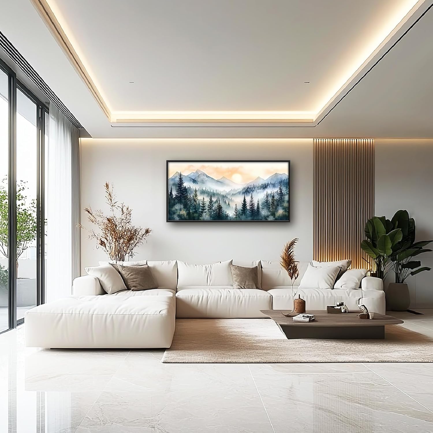 Large Misty Mountain Forest Wall Art for Living Room, Framed Foggy Sunrise Landscape Wall Decor Oversized Watercolor Canvas Painting Modern Artwork Home Decoration for Bedroom Office 60"x30"