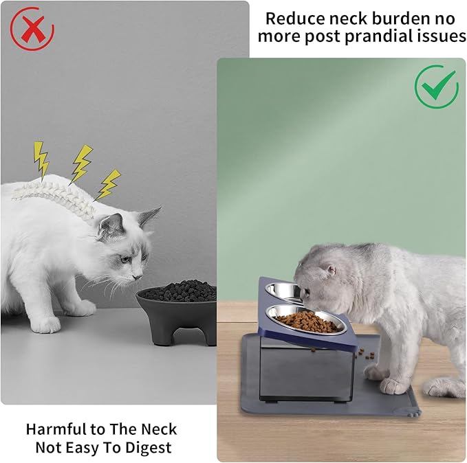 Upgraded Elevated Cat Bowls with Food Mat,15°Tilted Stand Anti Vomiting Raised Cat Dishes for Food and Water,2 Stainless Steel Bowls for Cats and Puppies(Navy Blue)
