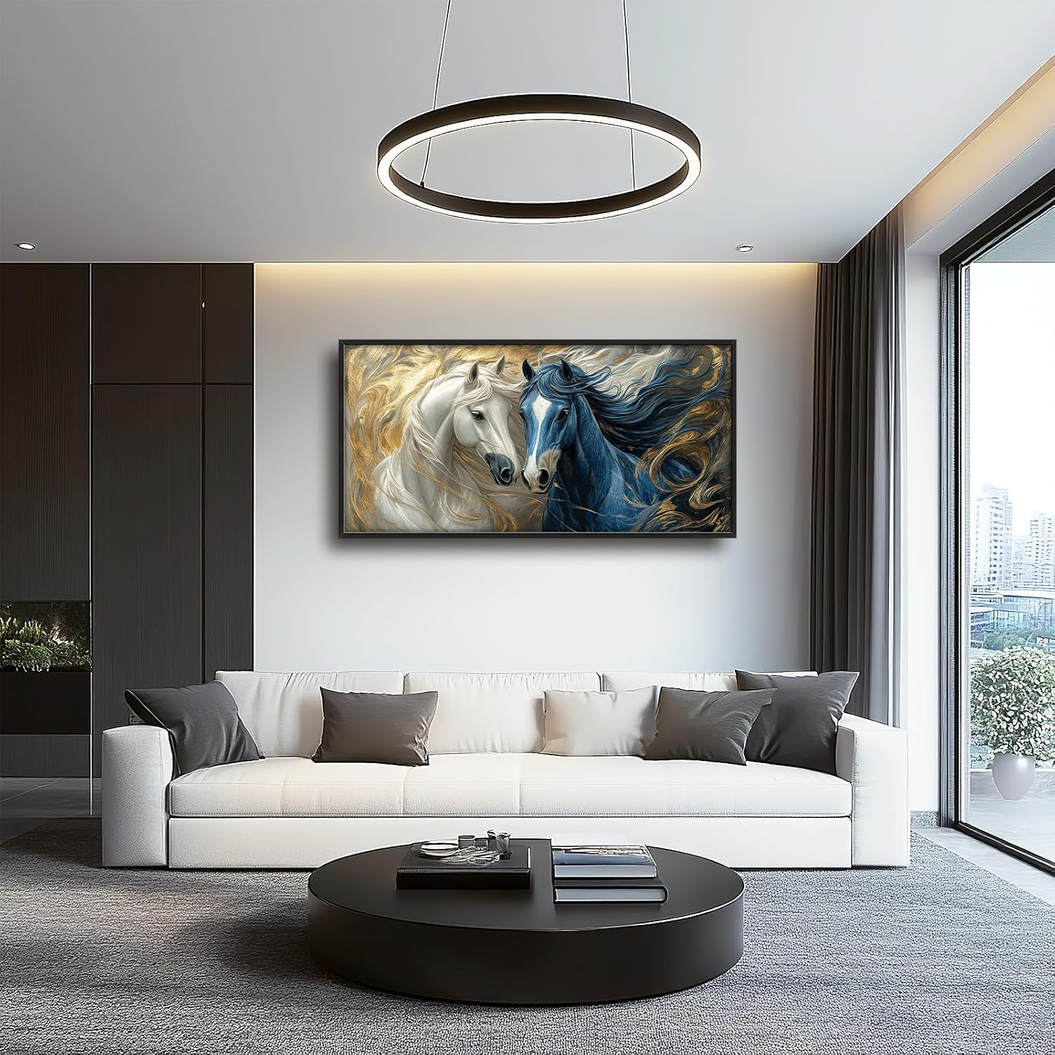 Framed Large Horse Wall Art for Living Room, Oversized Abstract Horses Wall Decor Blue and Golden Canvas Painting Animal Pictures Modern Artwork for Living Room Bedroom Office 60"x30"