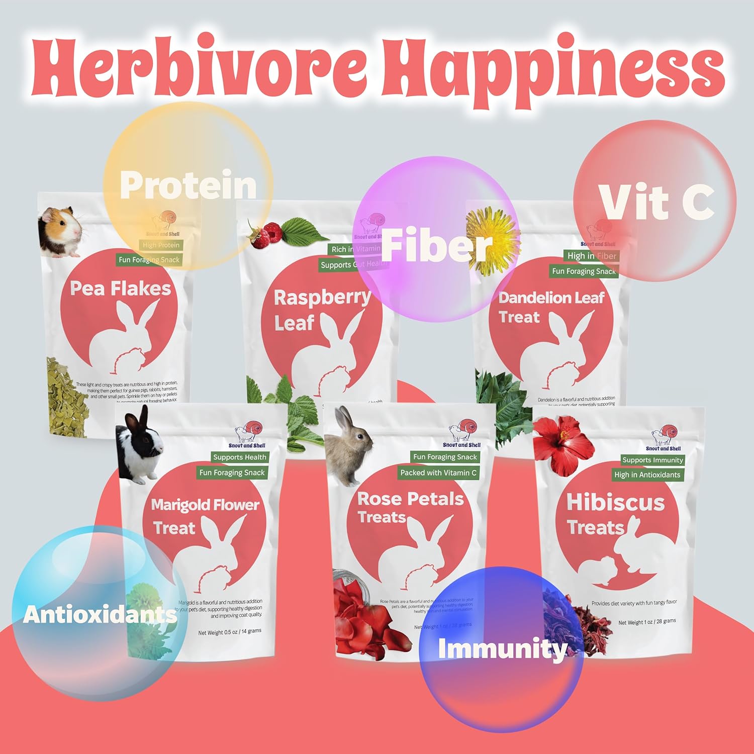 - 6-in-1 Natural Treat Mega Pack – Includes Pea Flakes, Dandelion Leaf, Raspberry Leaf, Marigold, Rose Petals, and Hibiscus – a complete foraging and wellness snack bundle for rabbits, guinea pigs, chinchillas & more.