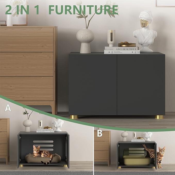 - Modern Aesthetic Appeal: The Amunrbrek cat litter box enclosure features a minimalist design with golden legs contrasting boldly against pure black or white cabinetry. It seamlessly integrates into living rooms, bathrooms, or hallways as a chic furniture piece.