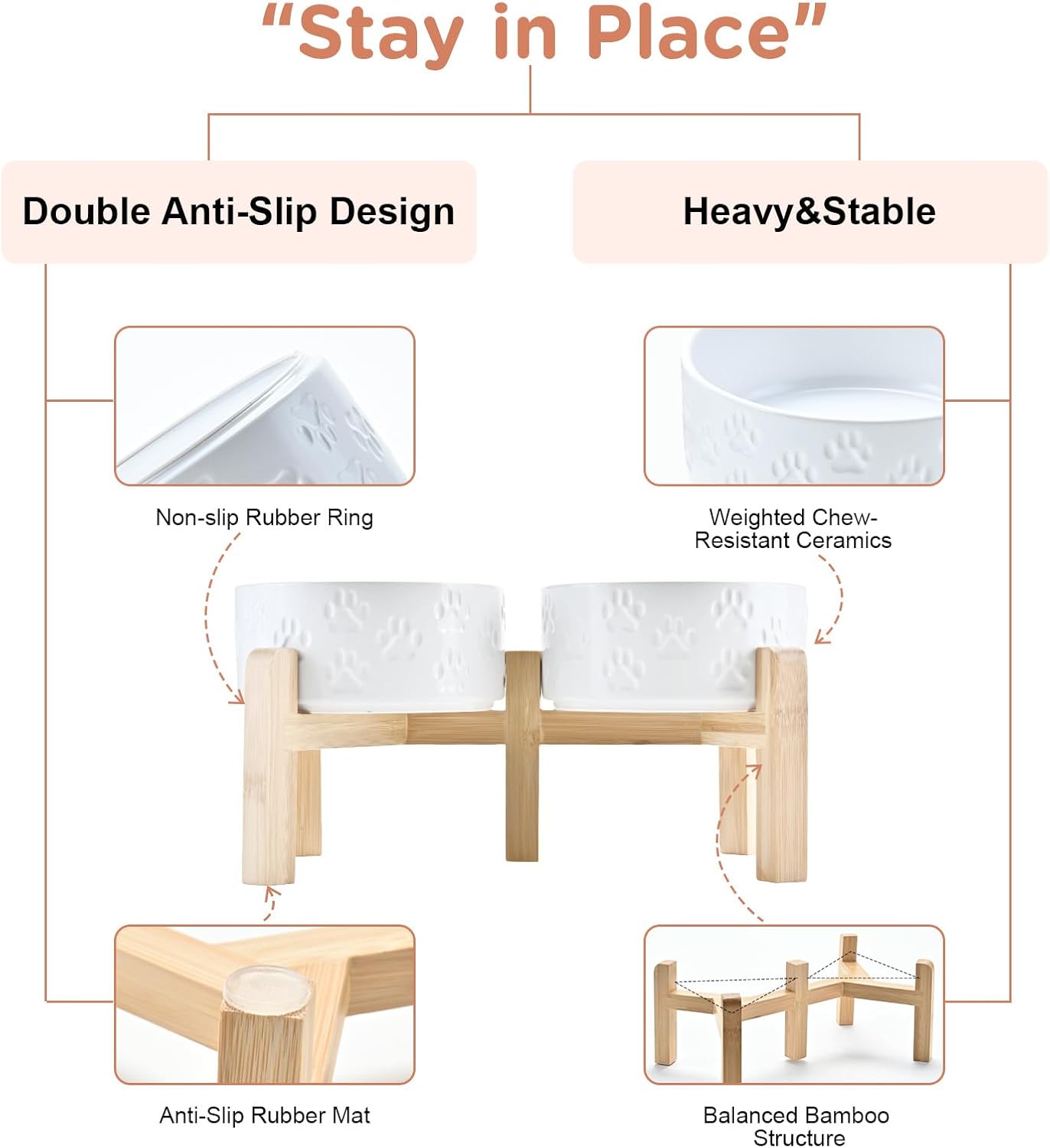 - Stable, Tip‑Resistant Design – A solid bamboo frame with Chew‑Resistant Heavyweight Ceramic, wide stance, and slip‑proof silicone pads join forces to create raised dog bowls that STAY IN PLACE on tile, wood, or laminate. Fewer spills mean cleaner floors and no accidental gouges or scratches or noisy