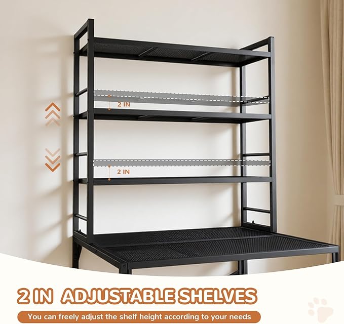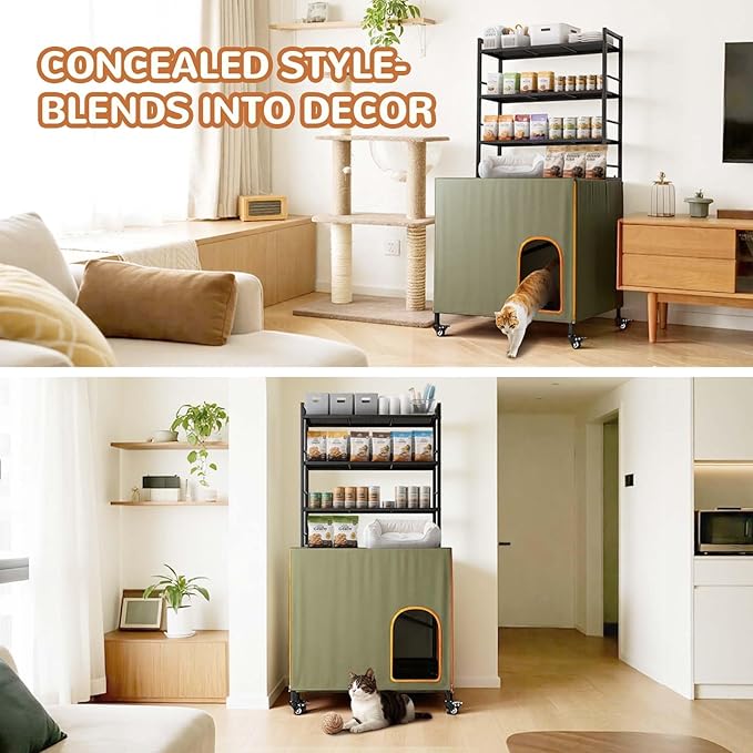 - Practical Adjustable Storage Shelves: The litter box furniture is more than just a hidden litter box, this multi-functional cabinet features a spacious 3-tier adjustable shelf (top section dimensions: 33" L x 12" W x34" H) to organize cat supplies, food, scoops, and more. Customize shelf heights to fit your essentials—keeping everything tidy and within reach for a clutter-free home