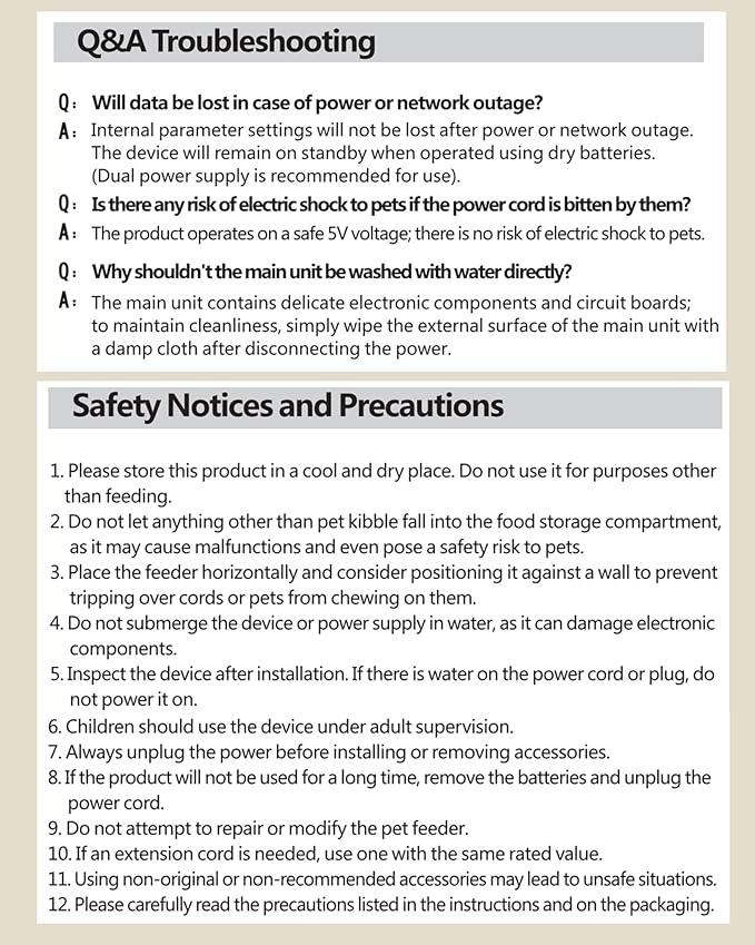 - Dual Power Mode: The automatically cat feeder automatic is powered by plug-in power and 3 C backup batteries (not included). Even in the event of unexpected power outage, your pet still receive a continuous food supply.
