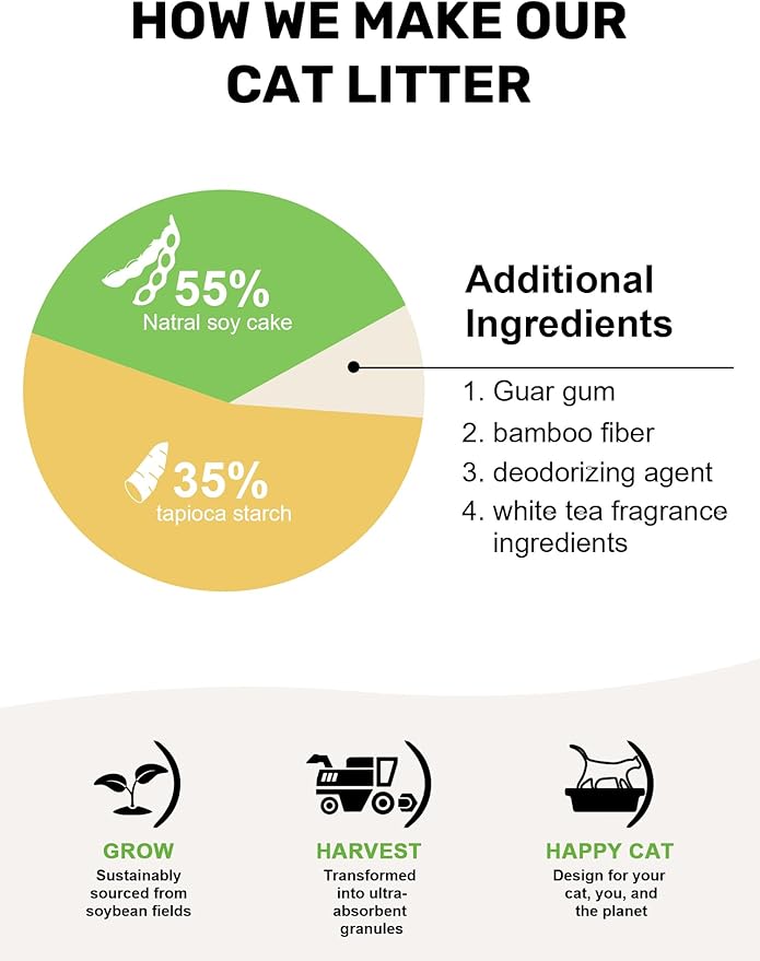 - Natural Plant-Based Formula - Crafted from premium soybean dregs, corn starch, and bamboo fibers. 100% biodegradable and water-soluble, it dissolves in 30 seconds and composts within 6 months. For sensitive cats and eco-conscious homes.