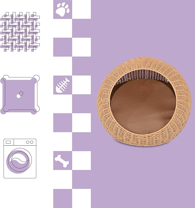 CBD3000A Fiora 19.5" x 18" Modern Circular Faux Wicker Pet Bed with Machine-Washable Cushion, Cat Beds for Indoor Cats, Natural