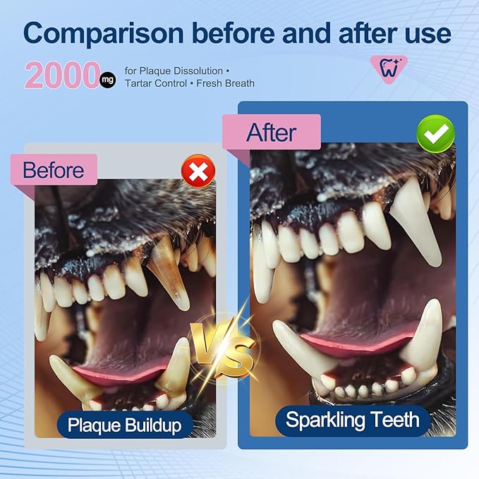 - Triple-Action Dental Care for Dogs & Cats:Specially formulated to target multiple oral health concerns:Plaque & Tartar Control: Enzymatic action breaks down biofilm, reducing tartar buildup;Long-Lasting Fresh Breath: Neutralizes sulfur compounds to eliminate food-related odors;Balanced Oral Microbiome: Inhibits harmful bacteria to prevent gingivitis and gum disease;Enamel Strengthening: Zinc ions + lysozyme form a protective layer to reduce tooth sensitivity.Visible results in 1-2 weeks: Reduced plaque and fresher breath for a whiter, healthier smile.