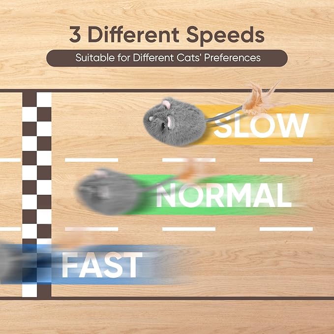 - 【Smart Touch Activation & Auto Off】In Auto Mode, a single paw tap restarts the fun! The mouse toys for cats pauses automatically after running for 5 minutes (letting cats take a break) and reactivates with a paw tap. Auto-shut off after 2 hours to conserve battery and prevent cats from excess playing.