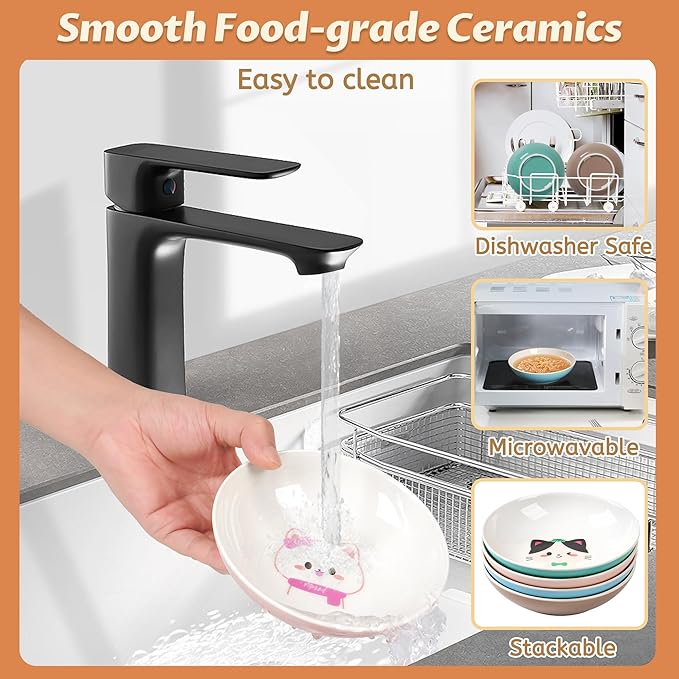 - 【EASY TO CLEAN AND STORE】: Made of thick healthy ceramic, This set of 4 cat bowls are food-grade, fired at high temperature, lead-free, smooth-glazed for easier hand-wash also microwavable and dishwasher safe. In addition, our cat dishes are stackable for space-saving.