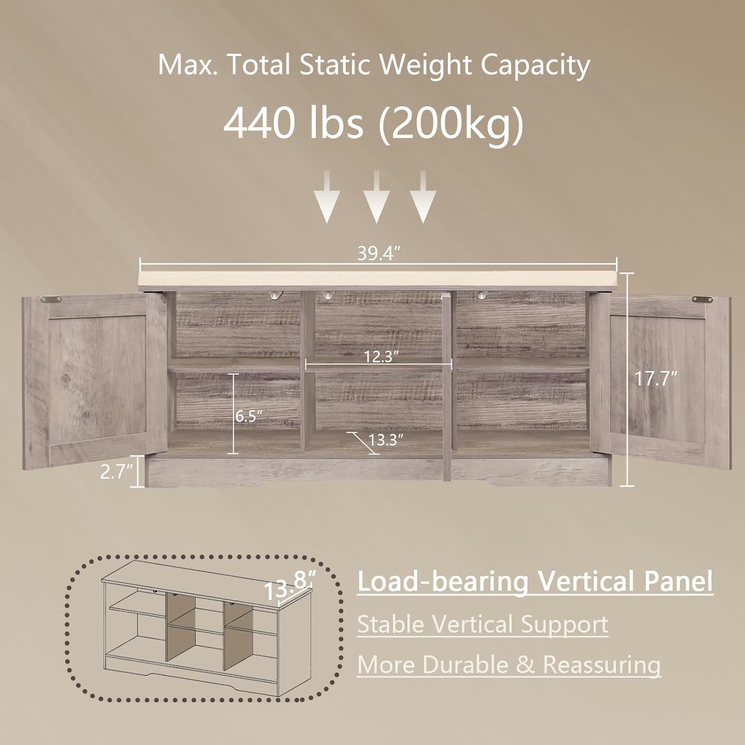 DINZI LVJ Shoe Bench, Entryway Storage Bench with Doors, Cushion, 2-Tier Shoe Rack with 6-Cubby, 39.4”L x 13.8”W Shoe Organizer Cabinet, Adjustable Shelf, Living Room, Bedroom, Greige