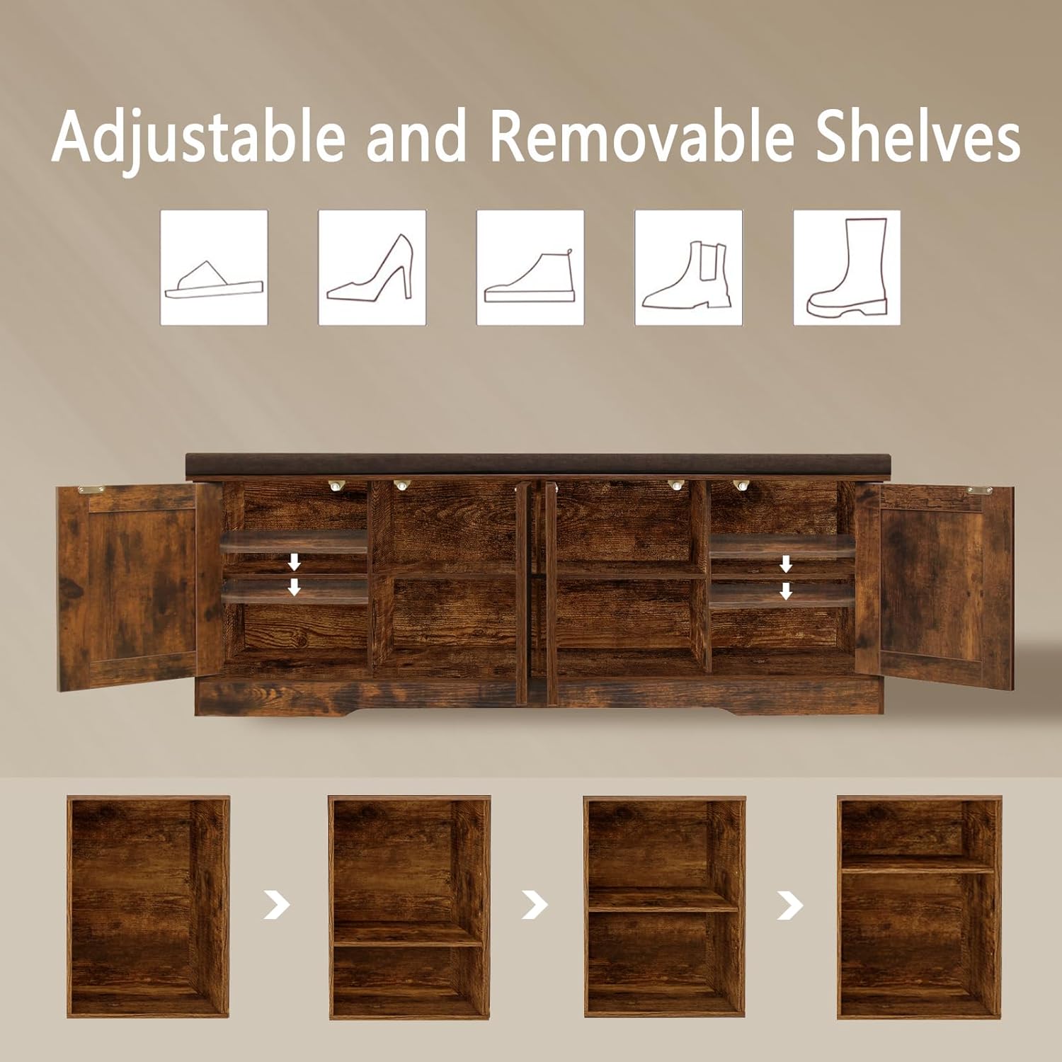 DINZI LVJ Shoe Bench, Entryway Storage Bench with Doors, Cushion, 2-Tier Shoe Rack with 8-Cubby, 47.2”L x 13.8”W Shoe Organizer Cabinet, Adjustable Shelf, Living Room, Bedroom, Rustic Brown