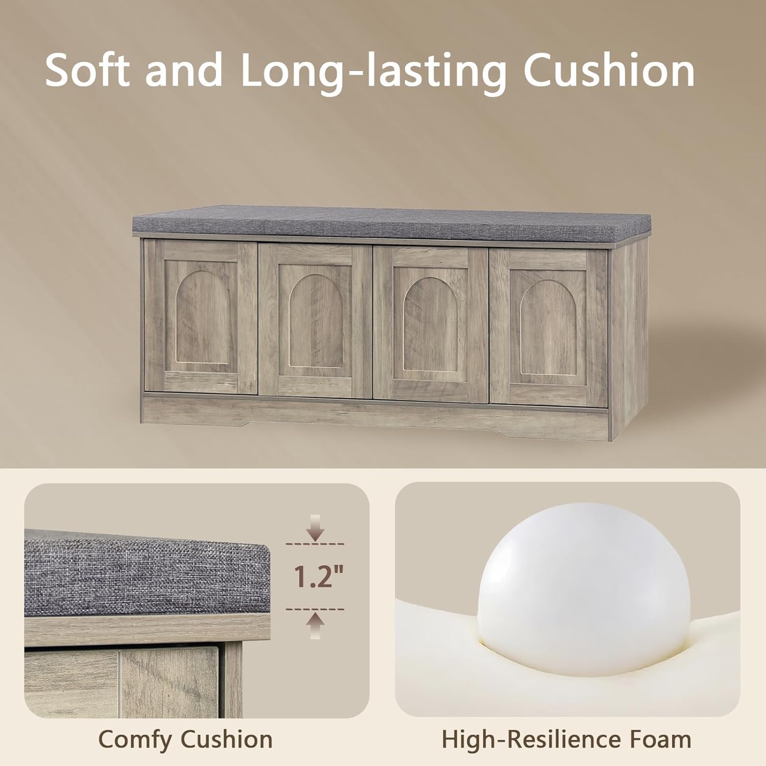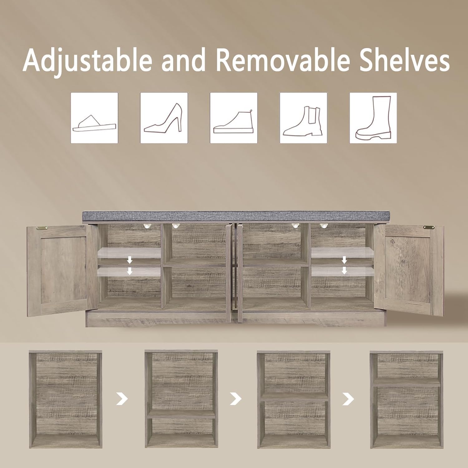 DINZI LVJ Shoe Bench, Entryway Storage Bench with Doors, Cushion, 2-Tier Shoe Rack with 8-Cubby, 47.2”L x 13.8”W Shoe Organizer Cabinet, Adjustable Shelf, Living Room, Bedroom, Gray Wash