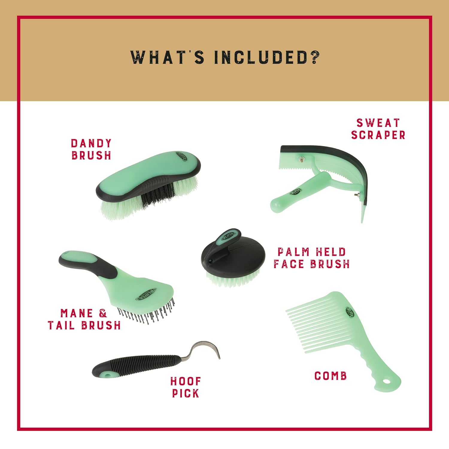 Weaver Equine 6-Piece Horse Grooming Kit, Ergonomic Gentle Horse Care Kit, Equestrian Supplies for Bathing Support, Detangling, and More, Mint/Gray