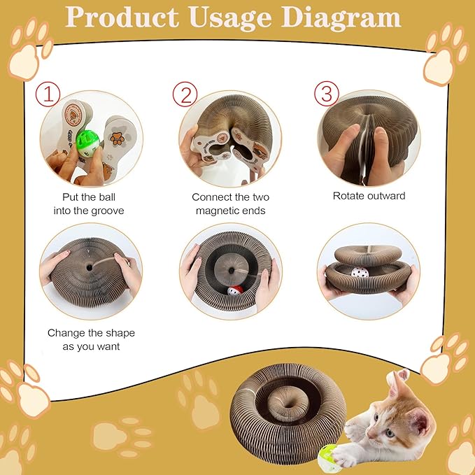 - 【New Upgraded Kitty Curls Cat Scratcher】This magic accordion cat interactive scratching board has upgraded four magnets,which provide stronger adsorption and stability when transformed into various shapes, and built-in bell ball,your cat will love to play with it and get enough exercise.