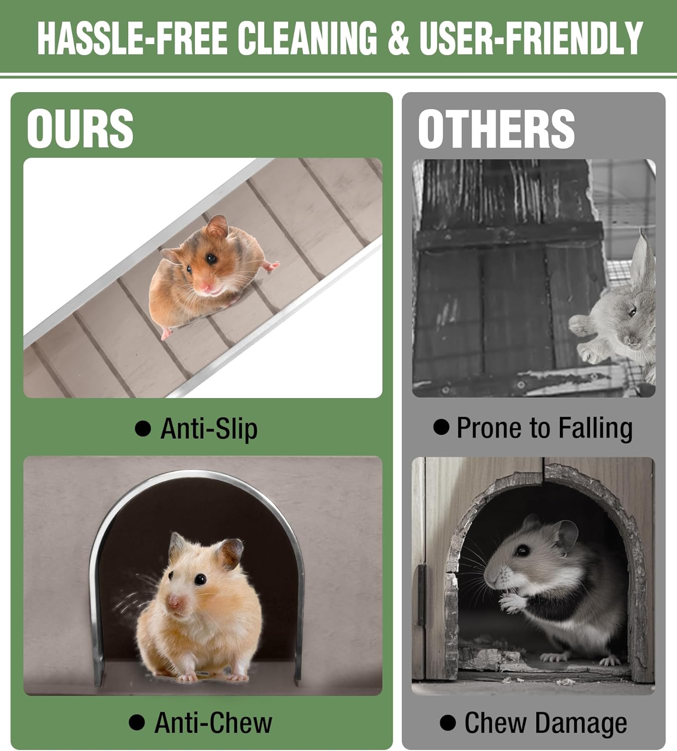 - 𝐑𝐞𝐦𝐨𝐯𝐚𝐛𝐥𝐞 𝐖𝐢𝐫𝐞 𝐌𝐞𝐬𝐡 𝐅𝐥𝐨𝐨𝐫 - Metal wire netting above the leakproof tray elevates pets, preventing contact with waste while allowing debris to fall through. Easy to remove for quick cleaning, keeping your small animal hygienic with minimal effort