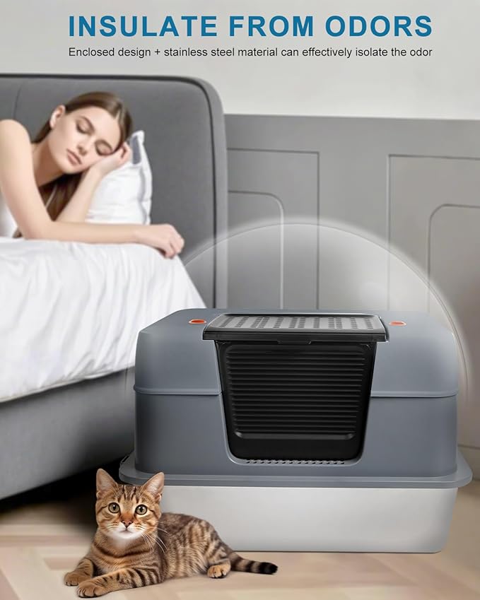Stainless Steel Enclosed Cat Litter Box with Lid,Covered Metal Kitty Litter Box with Litter Mat and Odor Reduction Pack(2kg), Metal Scoop,Switchable Design, Easy Clean (Litter Box Grey)