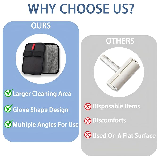 - 【Efficient Pet Hair Removal】The pet hair removal glove uses static electricity and a unique design to effortlessly collect pet fur. Clean larger surfaces in less time. Just glide your hand and watch the hair collect in seconds. Ideal for busy pet parents