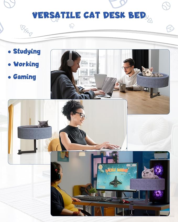 - SPACE-SAVING: Elevated cat bed is perfect for offices and play areas, offering a cozy retreat for your feline friend while saving valuable floor space. Designed to accommodate desk thicknesses ranging from 0.75" to 2.16", this versatile cat bed fits most office desks, upright tables, gaming tables, and more. It caters to your cat's natural instincts, making it an ideal addition to any home office or bedroom. This sleek design provides a stylish alternative to bulky cat climbing frames, ensuring both comfort and elegance in your space.