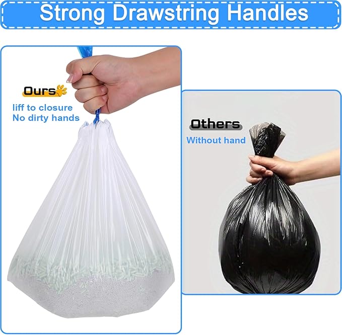- Drawstring Design Litter Liner Bags: The cat litter pan liners bags adopt sturdy dual drawstring closures for quick, mess-free litter replacement, which prevent the litter from exposing, and the smell overflows. Just grab the drawstrings, lift and the bag comes out, no spilling or breaking or mess