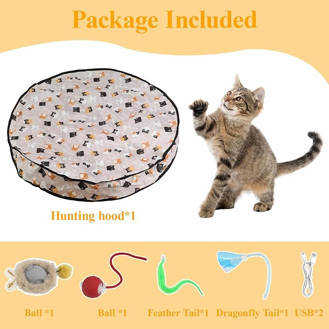 - 1. 5 Play Options 2 balls +hunting hood+ 3 tails included! The gray ball works with a hunting hood (prevents rolling under furniture) or rolls freely for floor chasing. The red ball features 3 interchangeable tails (string/dragonfly/caterpillar) to stimulate different hunting instincts.