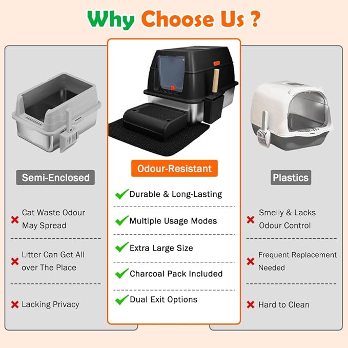 - Bonus Accessories Included: Includes a trapping mat to reduce litter scatter, a scoop for easy cleaning, a step for easier access, a charcoal filter for odour control, slip-resistant pads for stability, and a user manual for quick setup