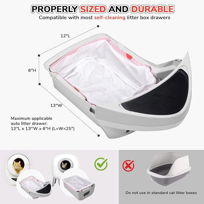 - Suitable for Automatic Litter Boxes: These are cat litter bags designed for self cleaning litter boxes, suitable for the robot waste drawer of the litter robot 4/3 and most self-cleaning cat litter boxes. Please check if these litter box liners are suitable for your litter box before purchase. In addition, they are suitable for collecting other waste, such as kitchen waste, bathroom waste and so on.