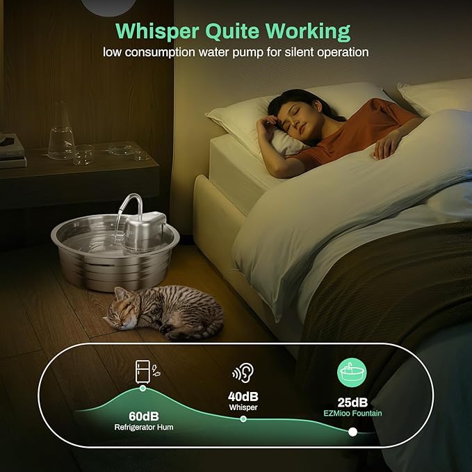 - WHISPER-QUIET WORKING: The fountain pump is ultra silent when running, keep it below 30db, only the sound of water flow can be heard. Even if it runs at night, it will not affect you and your pet’s sleep