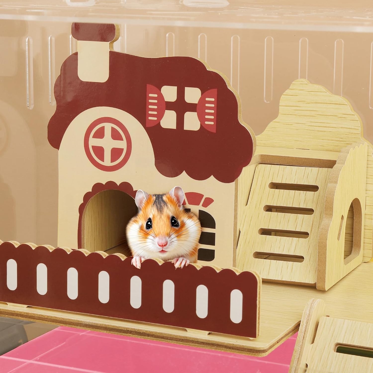 - 【Includes Accessories & Toys】This acrylic hamster cage encompasses everything needed for pet care.A wooden garden house that satisfies the hamster's instinct to dig. Inside the mice cage, you'll find a food bowl, stairs, an extra-large 18cm exercise wheel, a bridge toy, an external bathing area, and a water bottle with a steel ball to prevent leaks. This makes it an ideal gift choice, especially for children.
