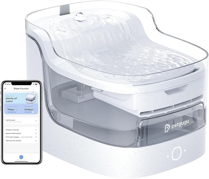 - Flowing Freshness, 8-Layer Purity: This advanced cat water fountain features an 8-layer filtration system including KDF, ion exchange resin, ceramic balls, and activated carbon—removing impurities and softening water for healthier hydration. The filter lasts 30–60 days depending on flow mode. Get timely filter reminders via the petgugu app—or simply use the pet water fountain without app control