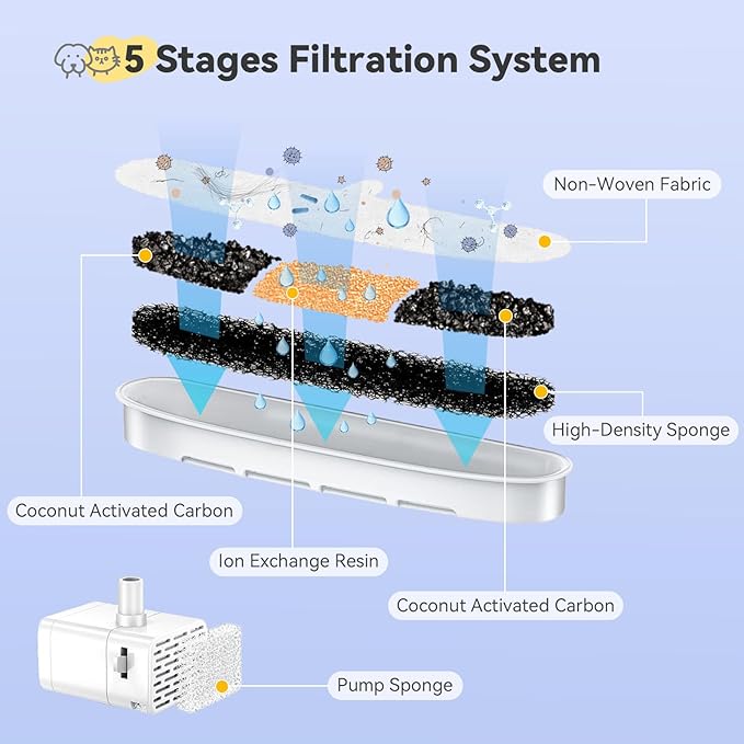 - 5-Layer Filtration: Cat water fountain replacement filter is composed of 4 types of materials, such as non-woven fabric, coconut activated carbon, ion exchange resin, and sponge; ensures effective filtration of impurities in the water