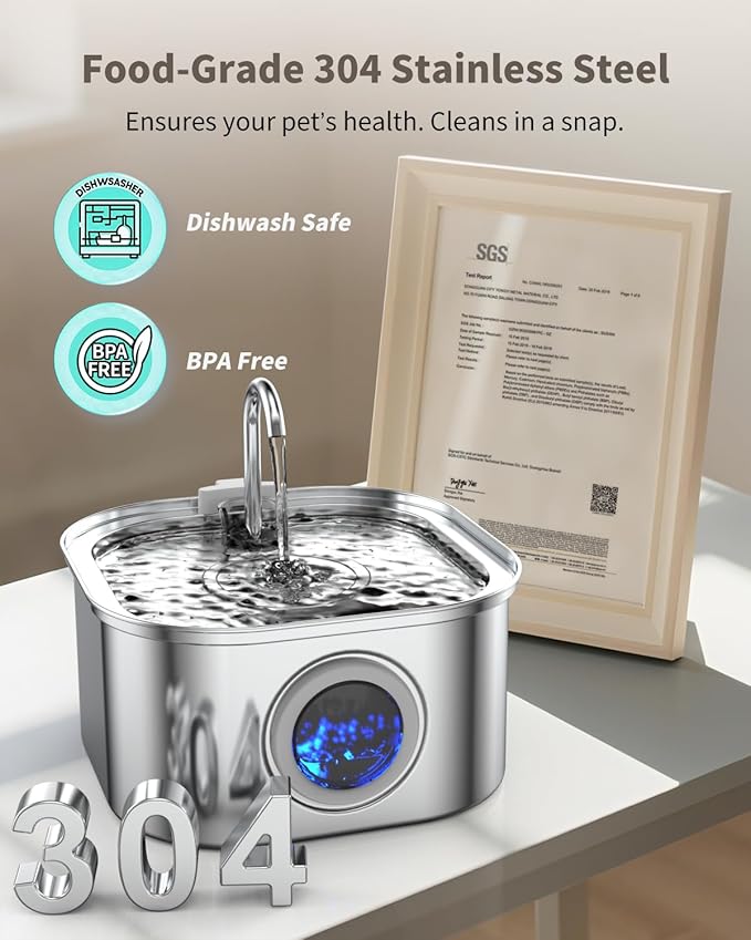 - 【Stainless Steel Safety】 Made from high-quality SUS 304 stainless steel, the water fountain is rust-resistant, corrosion-proof, and durable. It's more hygienic than plastic alternatives, easy to clean, ensuring your cats and dogs always have access to a safe and healthy water source.