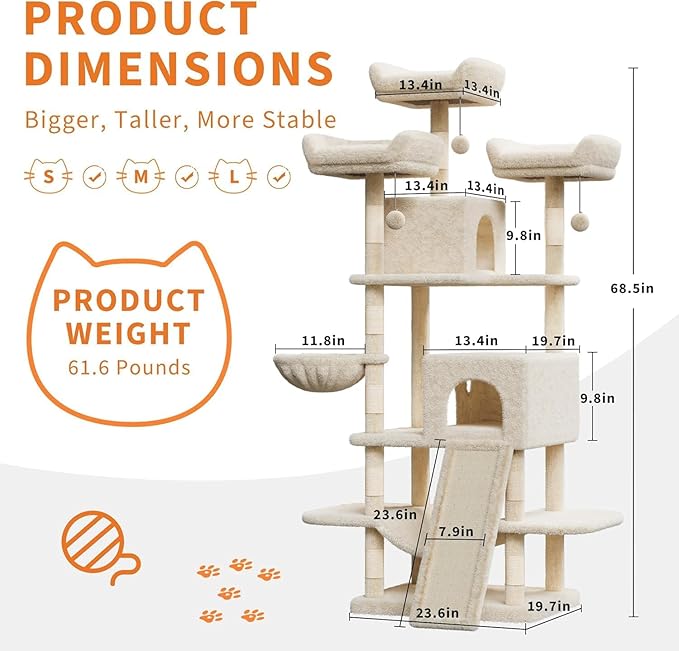 68.5 Inch Multi-Level Cat Tree, Plush Cat Tower with Condo/Sisal Scratching Posts/Hammocks/Basket/Dangling Ball/Platform, Heavy Duty Cats Tree to Play and Sleep, 2605#Beige